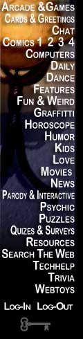 computer tech help cartoons cartoons cartoons The Game Arcade Love Resources Send a Greeting card! Cards for everything! Movies and sounds Chat via a web page! Daily news to help you make it through the day cartoons computer tech help files online quizes Puzzles, jigsaws and other thoughtful activities daily news, sits of the day and other resources online quizes Dancing page fre for all link list daily news, sits of the day and other resources site features All kinds of fun you can do from a web page The Graffiti Board surveys and polls Horoscopes and predictions computer tech help Computer humor pages The kids page for all kinds of clean fun Dance Web ring
